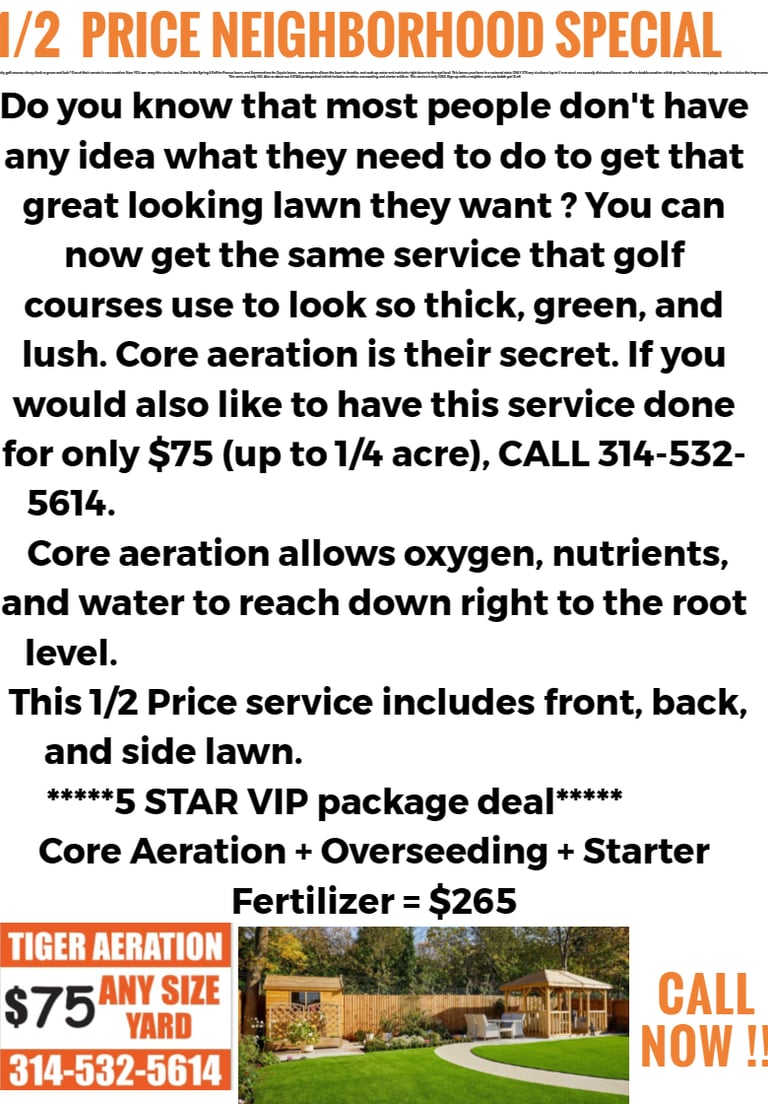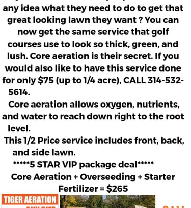 LAWN CORE AERATION $100 ANY SIZE UP TO 1/4 ACRE